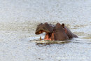 The hippo is semi-aquatic, inhabiting rivers and lakes where territorial bulls preside over a stretch of river and groups of 5 to 30 females and young. During the day they remain cool by staying in the water or mud and reproduction and childbirth both occur in water.